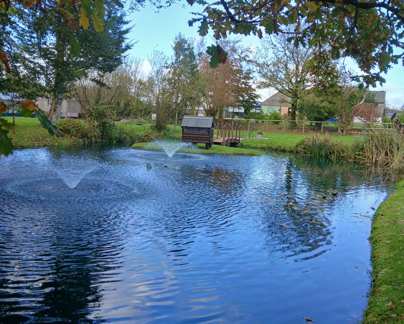 In the summer the pond meadow was upgraded, as can be seen from the image to the right. This included treating the pond to remove duck weed and other growth and installing two aerating fountains. The installation of a custom built bridge leading to the duck house island, finished the job! The moor hens and ducks were dubious of the fountains to start with, but have now returned.